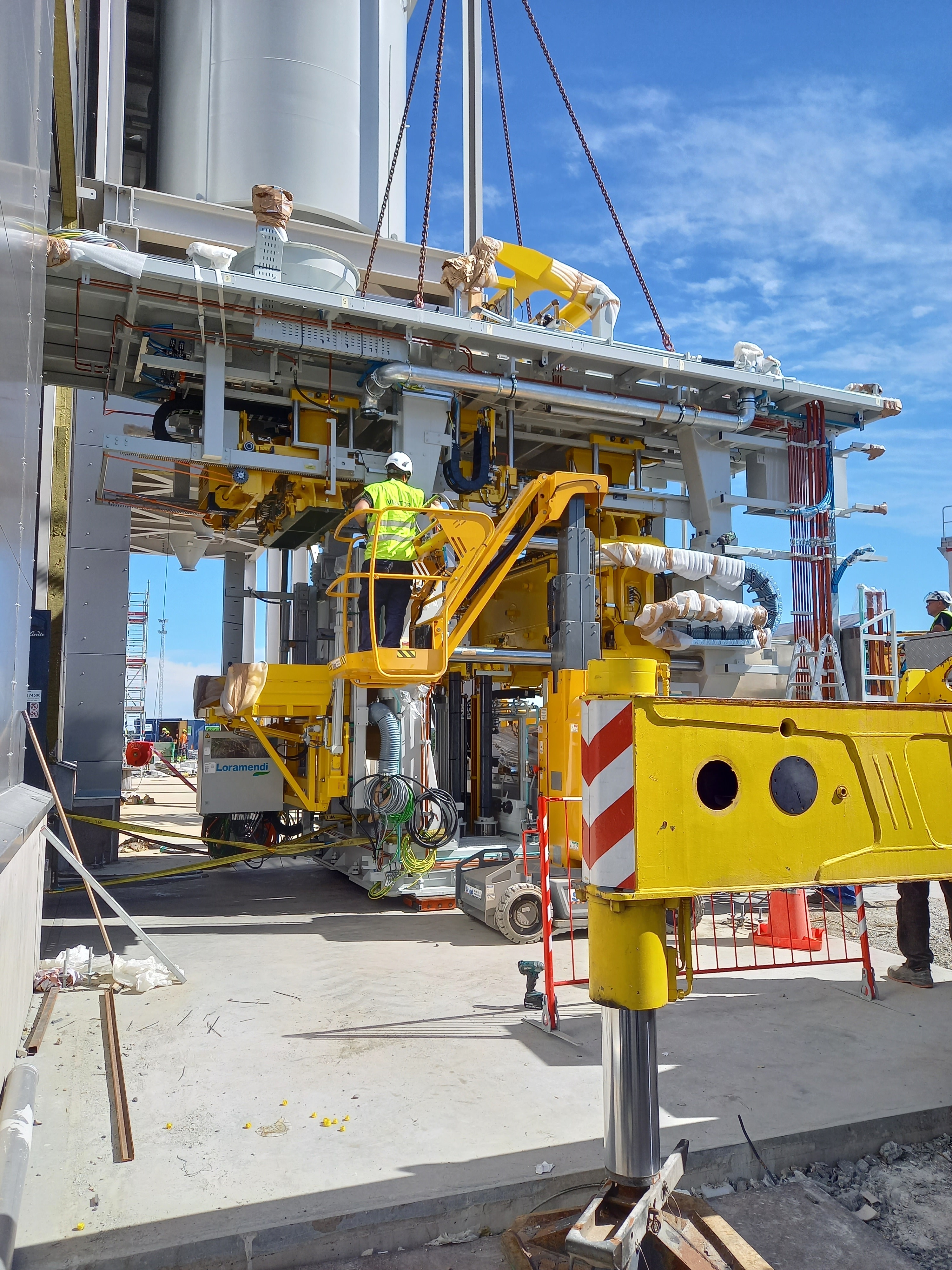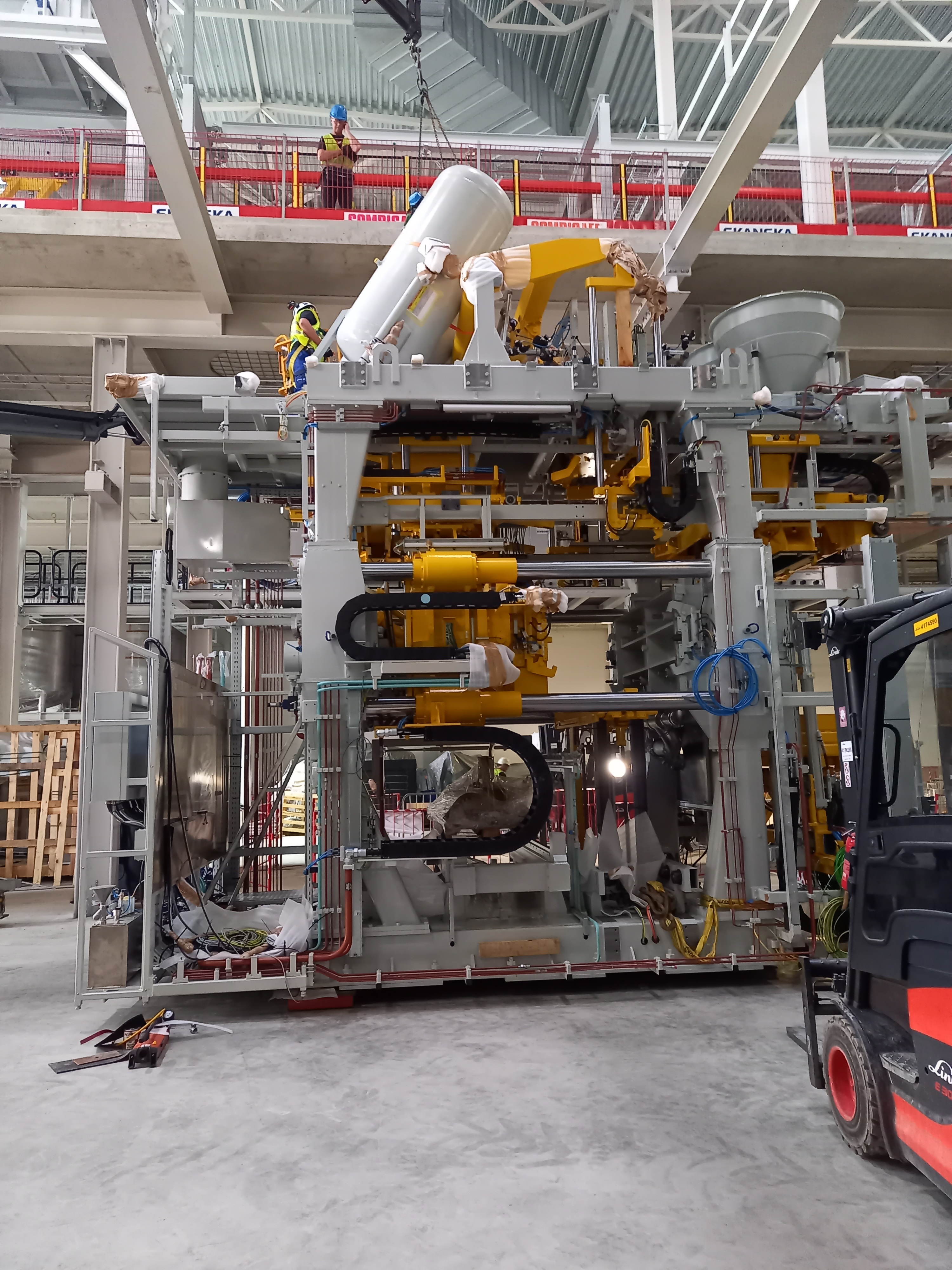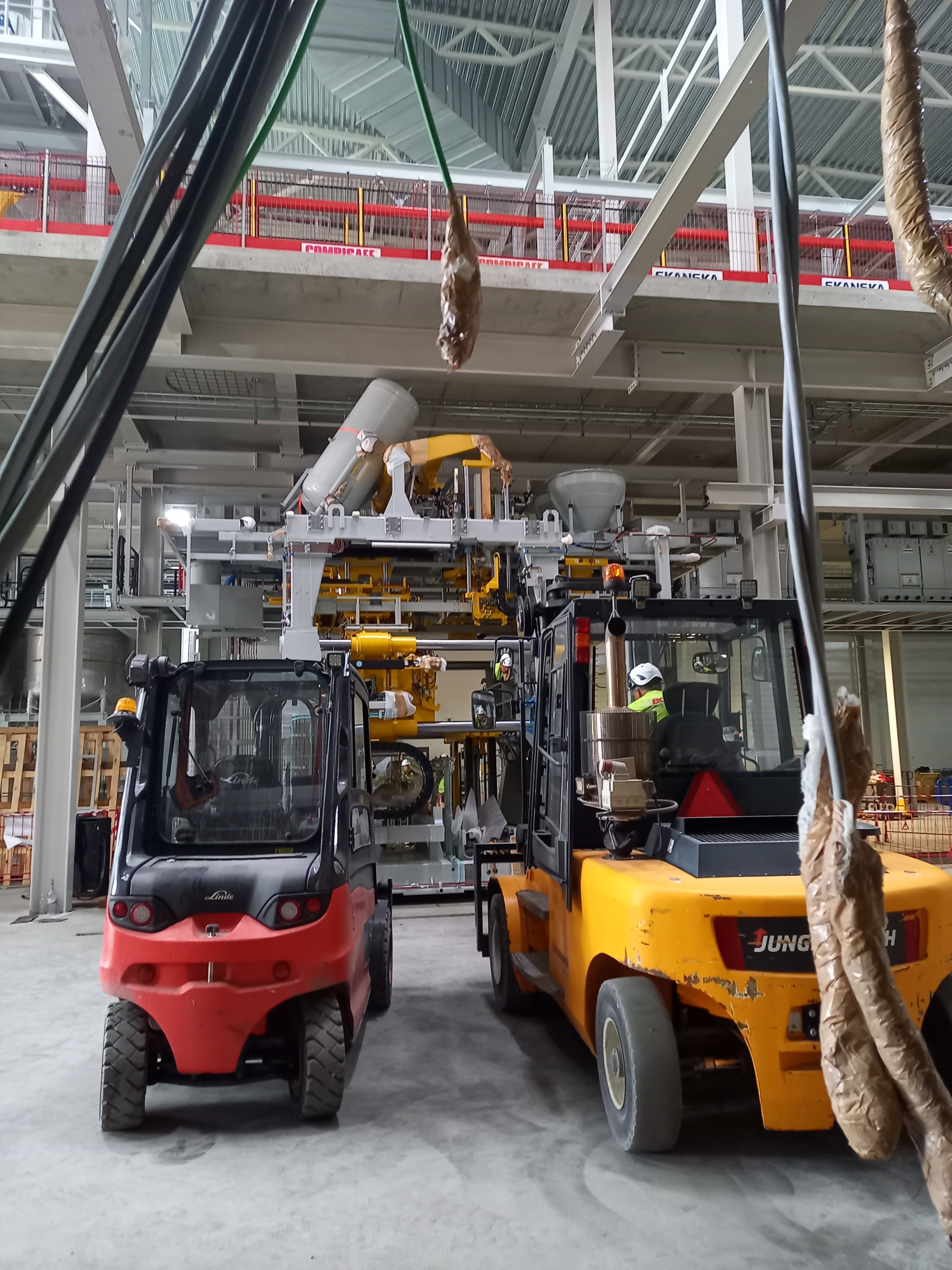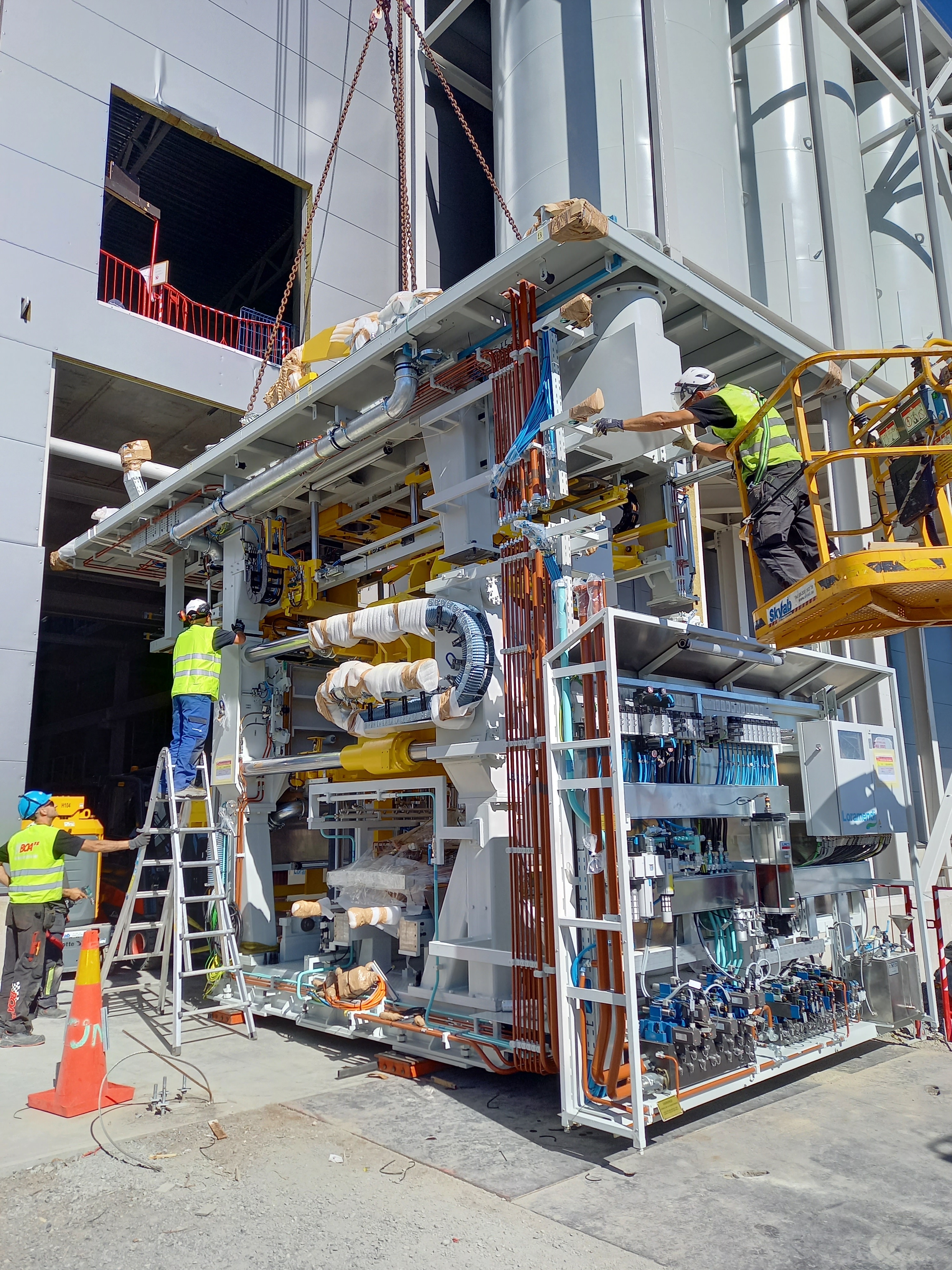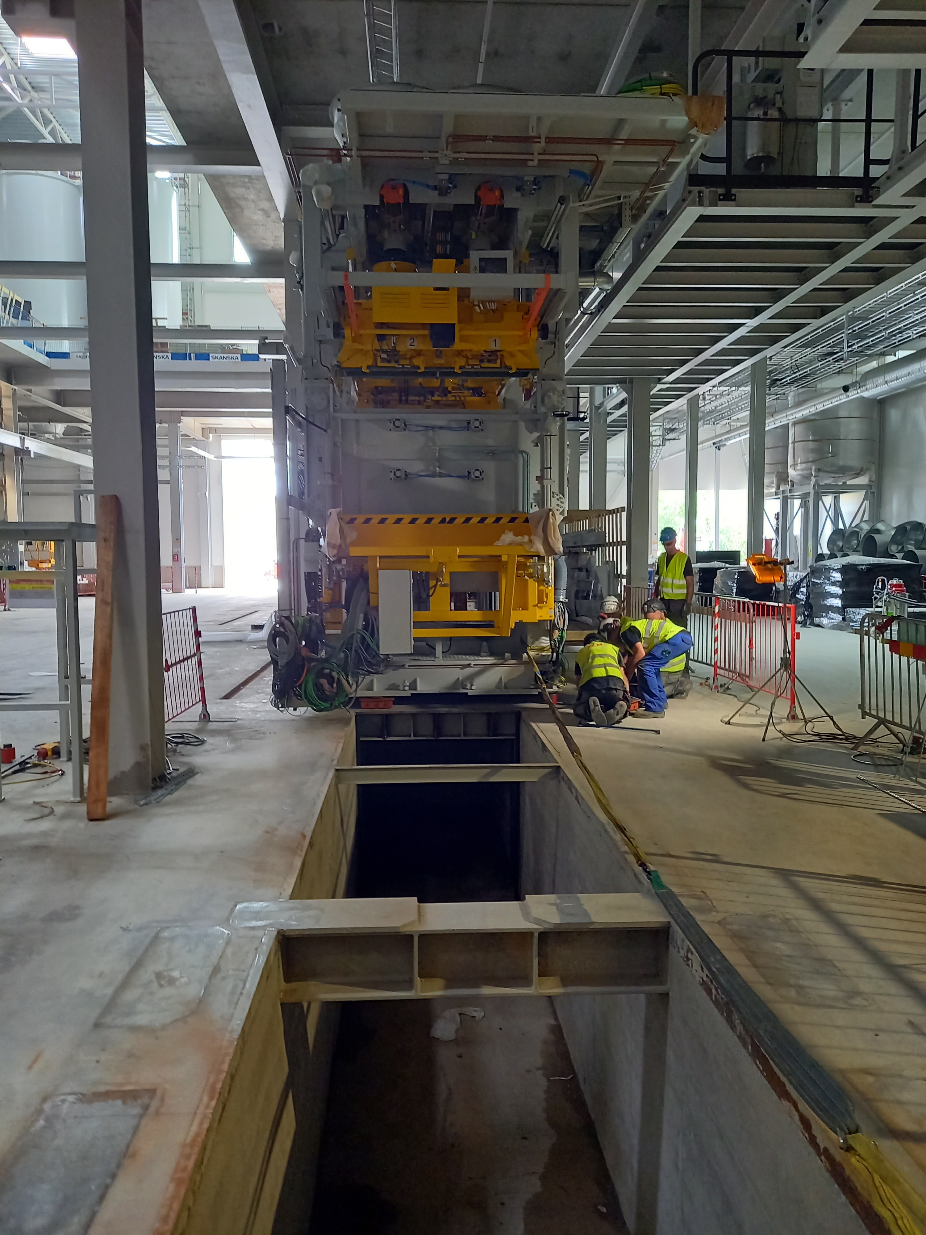 Maskinen var tvådelad och monterades ihop utanför bygganden på grund av platsbristen inomhus. Den rullades sedan in med hjälp av två truckar och maskinskridskor över en rörgång.