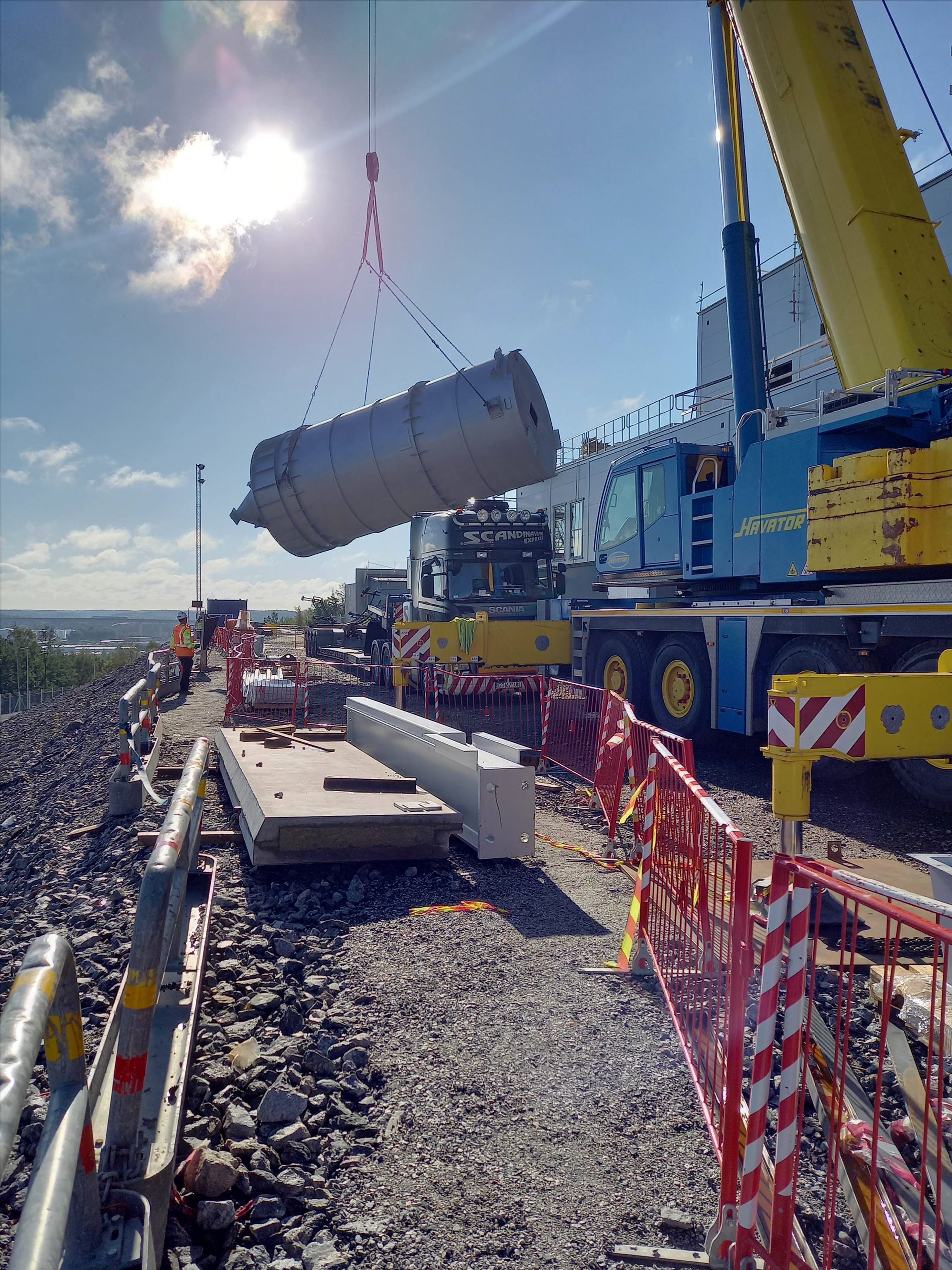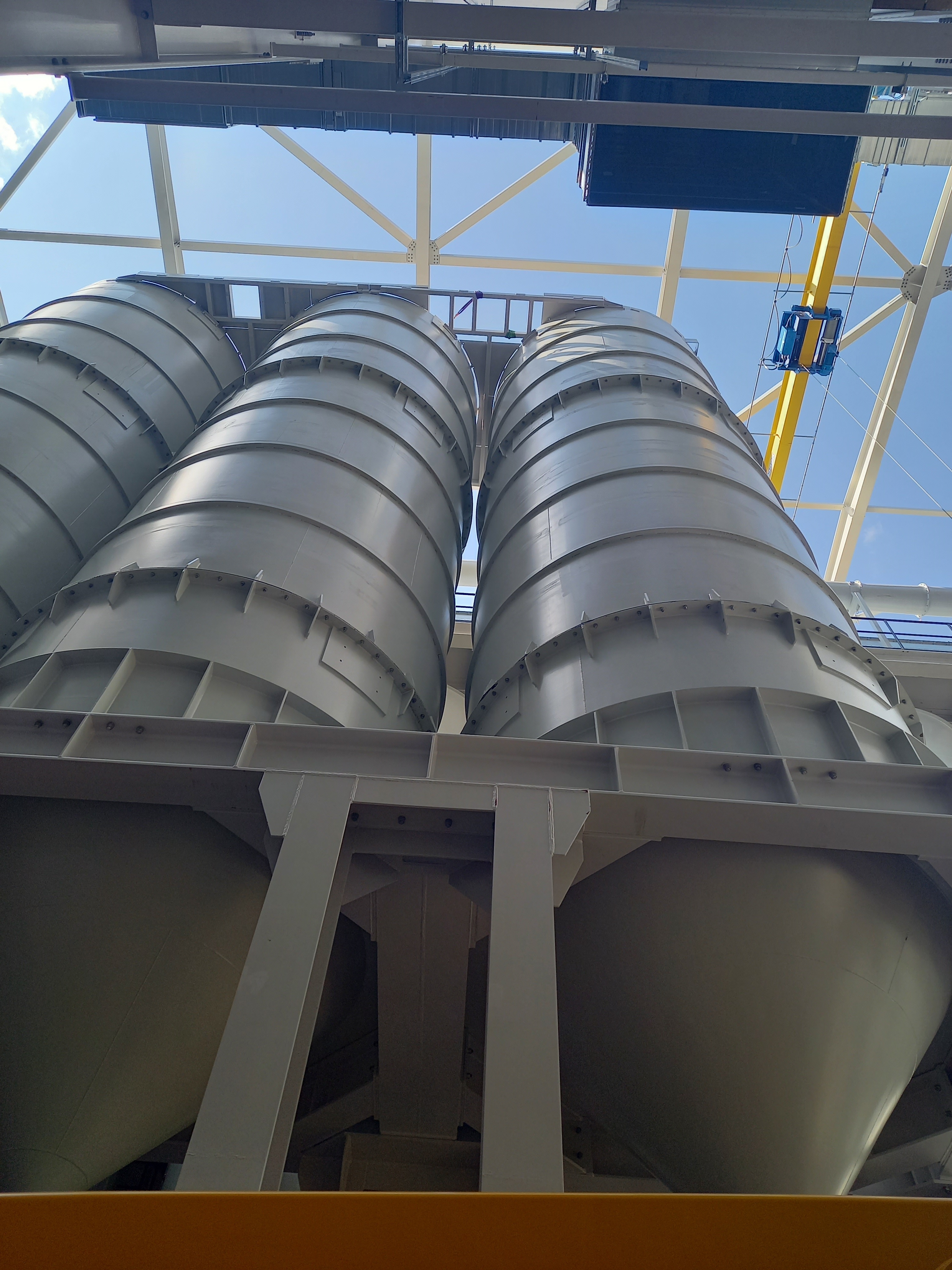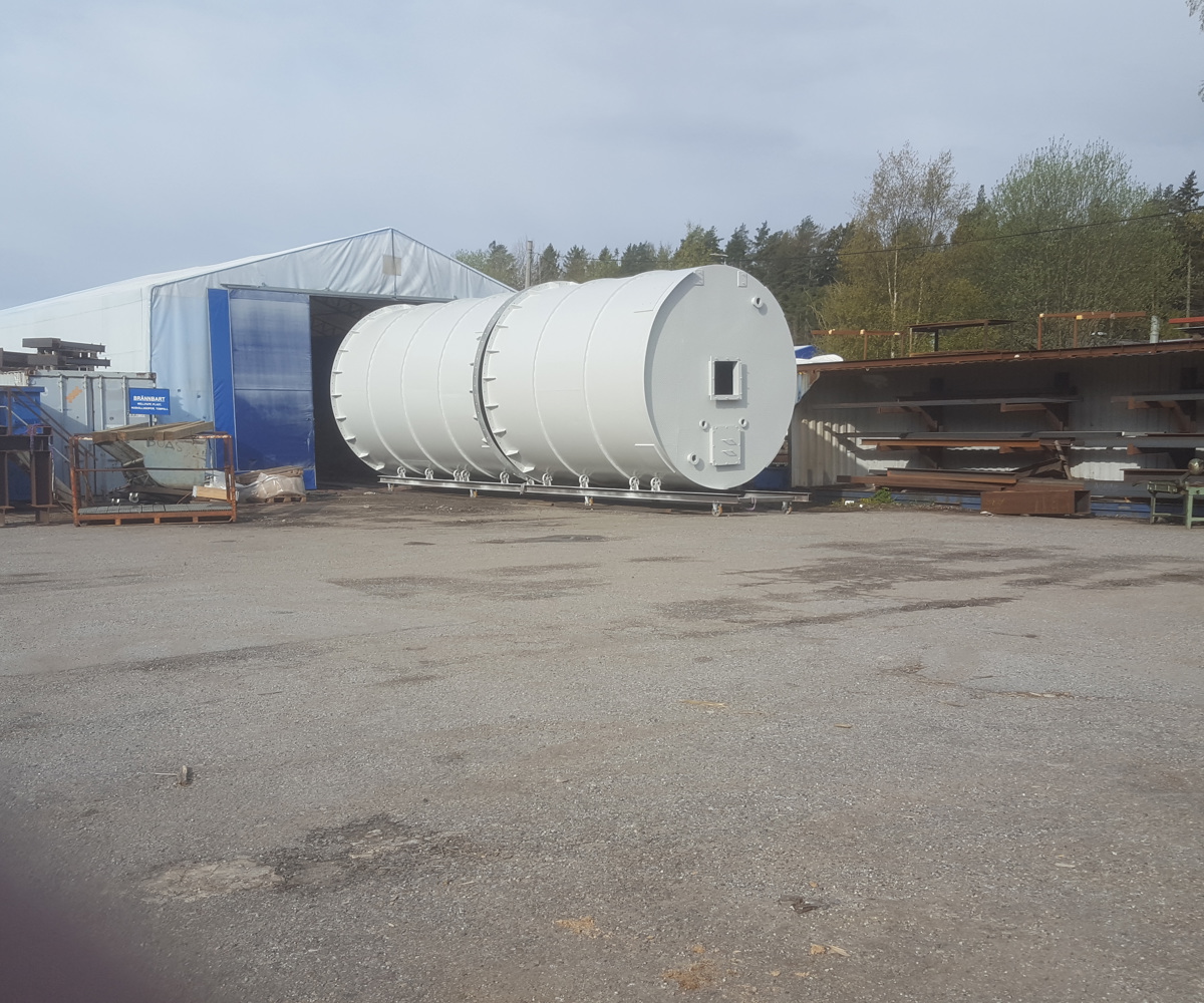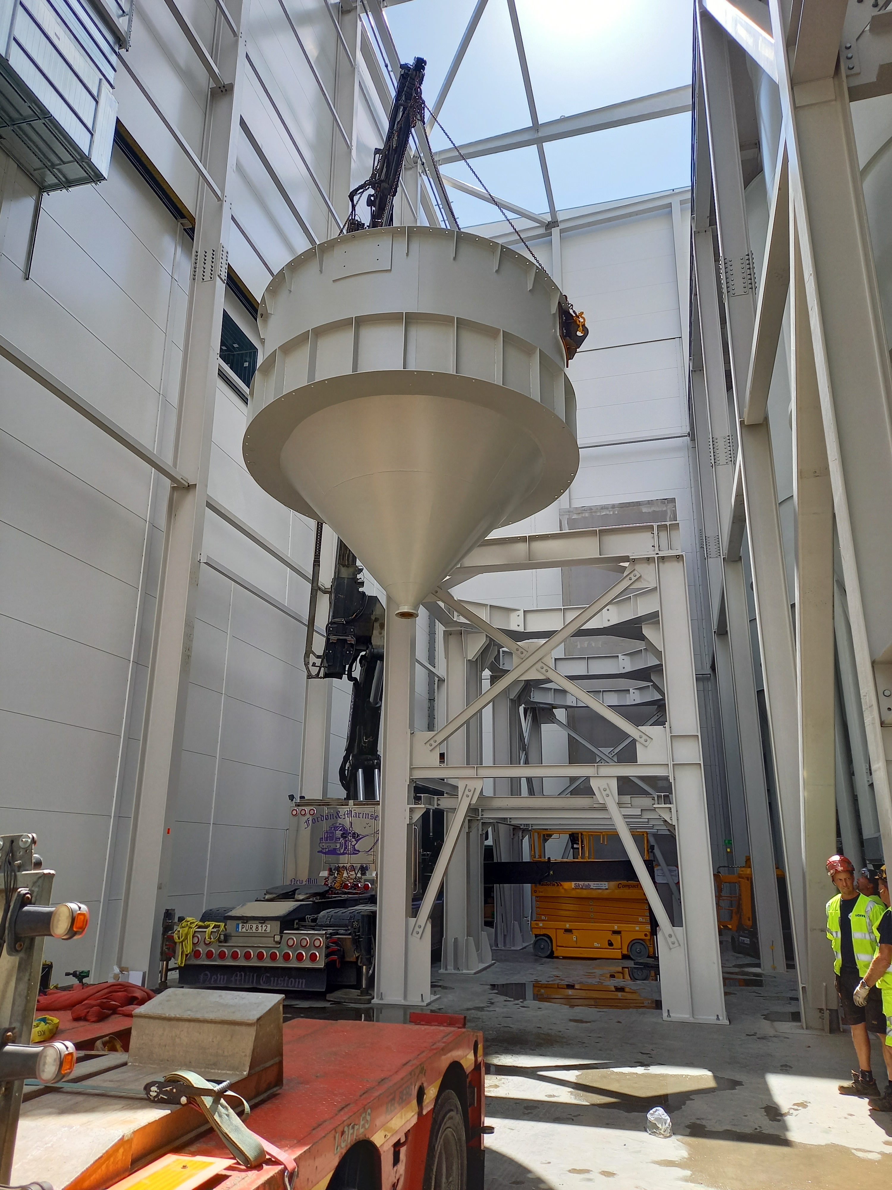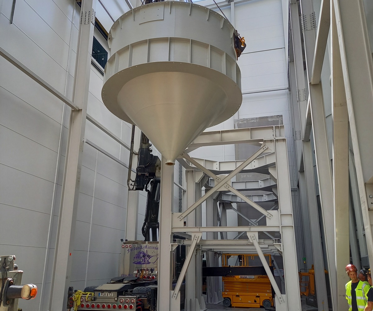 Silon är gjord för att lagra sand och är över 14 meter hög. Den tillverkades från grunden i våra produktionslokaler i Södertälje och monterades tillsammans med rörledningar och maskiner.