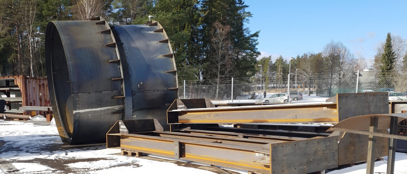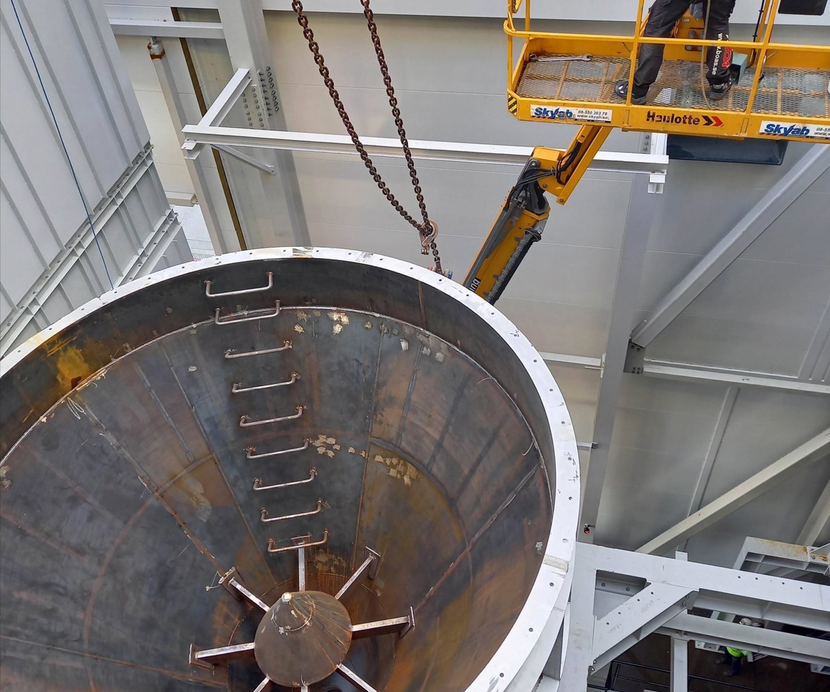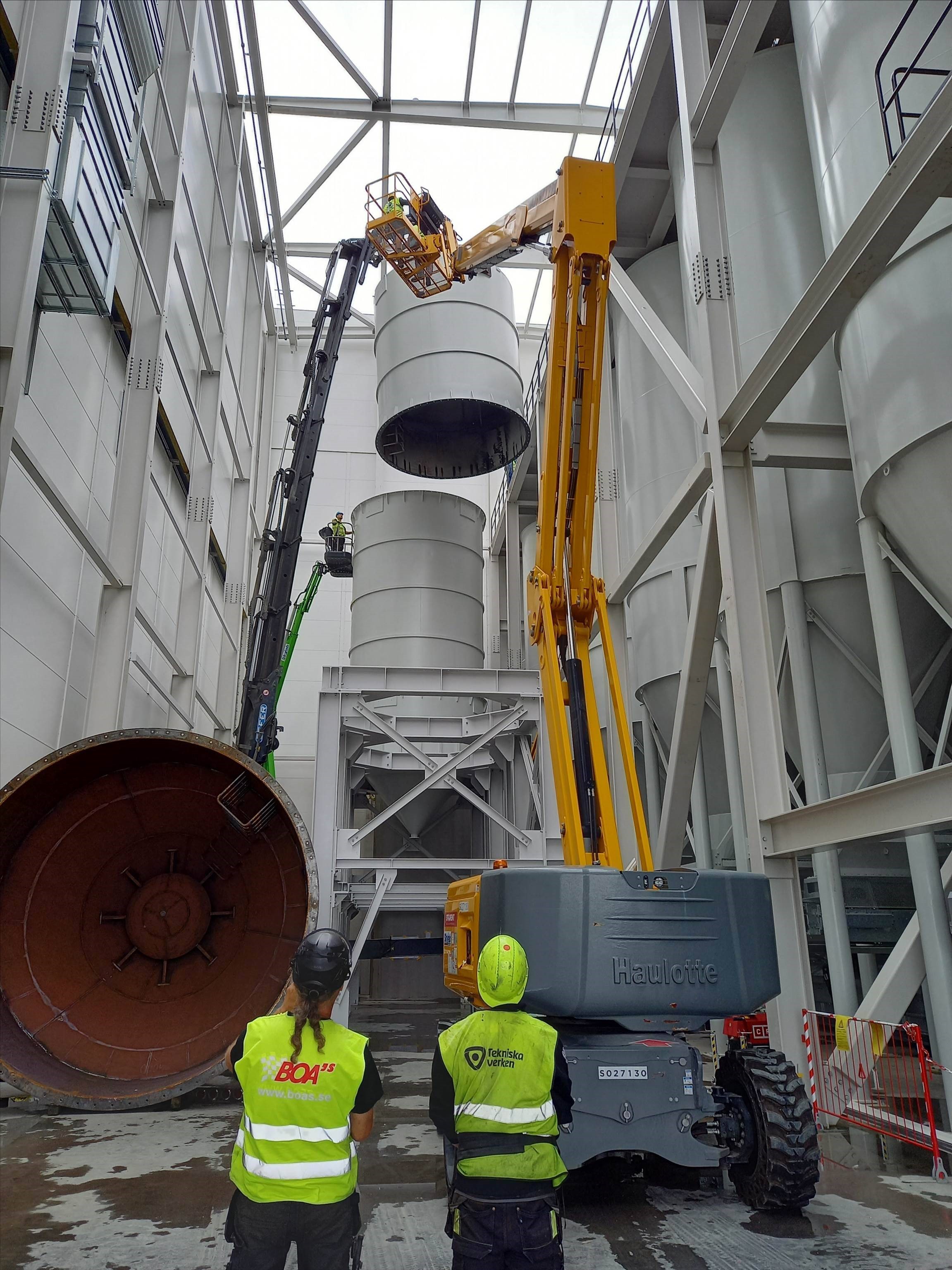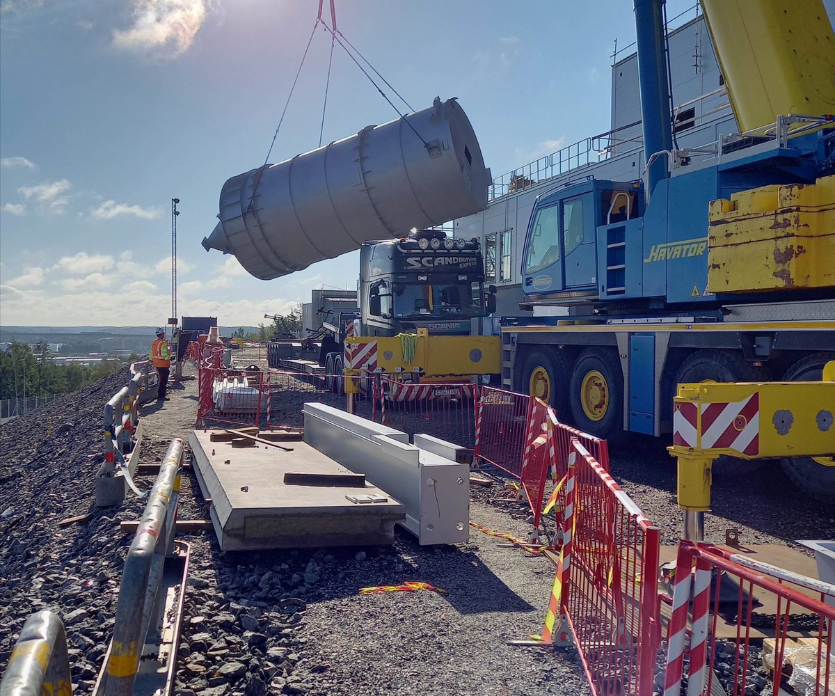 Silon är gjord för att lagra sand och är över 14 meter hög. Den tillverkades från grunden i våra produktionslokaler i Södertälje och monterades tillsammans med rörledningar och maskiner.